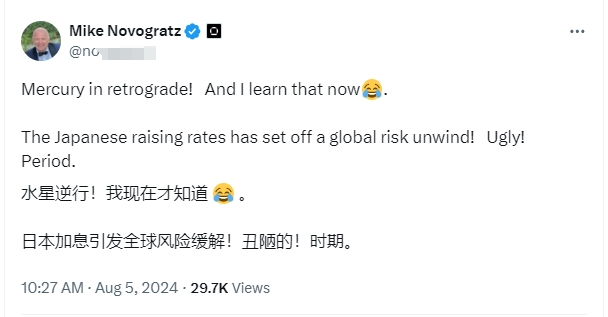8月5日,Galaxy首席執行官Mike Novogratz在X平臺發文稱,日本加息引發全球風險規避。這表明短期內市場可能會繼續波動。