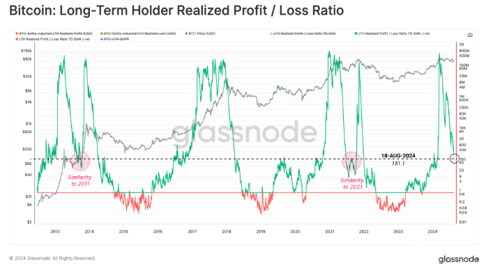 根據(jù)Glassnode的最新報(bào)告,Bitcoin的長期持有者在當(dāng)前橫盤走勢中每天仍保持約1.38億美元的利潤。這表明市場上仍有大量資金流入,以吸收拋售壓力,從而在波動的市場中維持Bitcoin價(jià)格的相對穩(wěn)定。