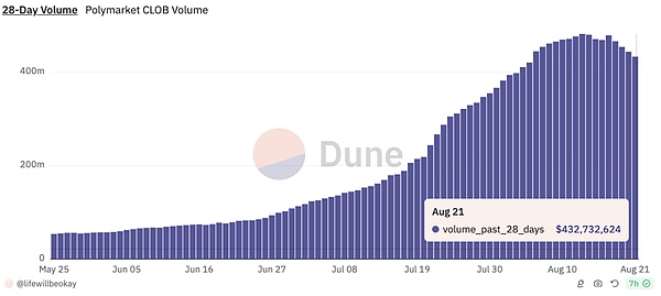 這些統(tǒng)計數(shù)據(jù)表明,用戶不僅使用Polymarket進(jìn)行賭博,還可以觀察重大事件更準(zhǔn)確的方向和賠率,這一說法也得到了DuneAnalytics的支持: