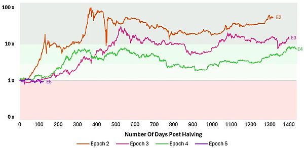 讓我們先來看看Bitcoin價格在過去幾個減半周期中的表現。很明顯,在減半后的第五個周期(2024年),Bitcoin的表現是減半以來最差的,也是唯一一個Bitcoin價格下跌的減半周期。