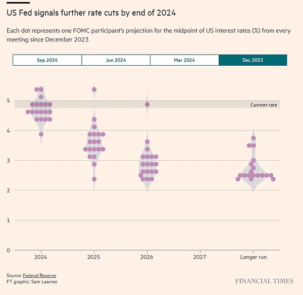 美聯(lián)儲(chǔ)官員們也明確表示他們不會(huì)止步于此,周三公布的所謂點(diǎn)陣圖預(yù)測(cè)顯示,聯(lián)邦公開(kāi)市場(chǎng)委員會(huì)(FOMC)的大多數(shù)成員估計(jì)今年政策利率將再下降半個(gè)百分點(diǎn),隨后在2025年進(jìn)行一系列降息,將利率保持在3.25%至3.5%區(qū)間。