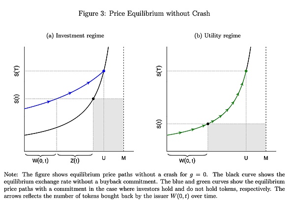 活動增長:假設交易平臺的活動以固定的增長率\(g 活動量:在沒有發生崩潰的情況下,平臺在時間\(t\)的活動量為 \(A(t)=e^{gt}\),否則\(A(t)\)接近于0。 此模型考慮了Tokens的效用需求和交易所為回購Tokens而投入的資源量如何與平臺活動成正比,進一步設定了交易所運行概率和違約強度,為理解交易所Tokens的市場動態提供了一個全面的分析框架。五、均衡分析 A.市場清算條件的圖形表示 在分析均衡結果之前,文章提供了市場清算條件的圖形表示。圖2展示了市場清算條件的機制,其中給定的X$(t)值由圖中的陰影矩形表示。向上傾斜的曲線代表了用戶向投資者和交易平臺提供Tokens的供給曲線。投資者和交易平臺持有的Tokens總量為W(0,t)+Z(t),用戶則持有剩余部分,即MW(0,t)Z(t)。用戶保持的美元余額為X$(t)。如果匯率上升,用戶愿意提供更多的Tokens,因為他們需要較少的Tokens來維持相同的美元余額X$(t)。這導致了匯率與投資用途Tokens數量之間關系的向上曲線。 B.有無投資者的均衡匯率 均衡匯率水平取決于平臺的回購承諾是否足夠大,能夠吸引投資者持有Tokens。要讓投資者持有Tokens,所需的回購資源隨著投資者預期回報的增加、平臺的失敗率上升而增加,隨著平臺增長率的增加而減少。 圖(a)顯示了當投資者選擇持有Tokens時,回購計劃下的均衡路徑;圖(b)則顯示了當投資者不持有Tokens,平臺僅從用戶手中回購時的均衡路徑。在g=0(平臺無增長)的情況下,黑色曲線未發生變化,匯率的變化完全由回購驅動。 推論1 在完全回購計劃中,如果Y$>(r+λg)X$,那么初始均衡匯率為 S(0)=1/M*Y$/(r+λg)。否則,初始均衡匯率為S(0)=X$/M。如果投資者持有Tokens,匯率的變化類似于戈登增長模型下持續增長的現金流估值。如果投資者不持有Tokens,初始匯率僅反映用戶需求與Tokens數量的比例。 六、平臺的回購計劃成本 A.資本成本與所需回報率之間的差距 本文利用模型評估交易所通過回購承諾籌集的額外資金與回購計劃預期成本之間的差異。交易所通過出售帶有回購承諾的Tokens獲得的資金,等于Tokens總量乘以均衡匯率。若沒有回購承諾,交易所出售Tokens的收入為X$,因此回購承諾帶來的增量收入為差額。C表示回購計劃整個期間的預期成本,這可以通過計算出整個計劃的折現成本來得出。 命題2 通過提供回購承諾,交易所能夠籌集的額外資金少于其預期的折現成本。 該命題表明,通過回購承諾籌集的資金成本高于投資者要求的回報率。因此,若交易所能夠通過更高效的資本市場以較低成本籌資,則應避免回購承諾。 B.價格操縱下的額外成本 通過回購承諾發行Tokens可能導致更高的成本,尤其是可能被大投資者通過“銷毀”Tokens(即永久凍結Tokens)來操縱價格。此時,平臺可能被迫無限期回購,推高Tokens價格。 1. 單一大投資者 命題3 如果一個大投資者持有用戶未持有的所有Tokens,則投資者可以銷毀部分Tokens,前提是某些條件成立。這使得Tokens價格上漲,回購速度放緩,最終導致平臺無法完成回購計劃,價格持續上漲。 2. 一個大投資者,多個小投資者 命題4 若最大投資者持有的Tokens比例達到一定水平,則銷毀部分Tokens對其有利。在這種情況下,即使有其他小投資者加入銷毀行動,最大的投資者仍能從中獲利。 3. 許多小投資者 當沒有單個投資者持有足夠的Tokens來進行操縱時,多個投資者可以通過合作銷毀Tokens獲利。這種合作通過Blockchain上的多重輸入交易可以實現,盡管在實際操作中協調多個投資者可能較為復雜。 4. 防止操縱 平臺可以通過限制回購承諾的Tokens數量來防止操縱。如果平臺承諾回購的Tokens數量超過Tokens總量的一半,則容易受到操縱。因此,許多平臺通常會限制回購承諾的比例在50%以內。七、具有投資動機的用戶 在本節中,討論了用戶對Tokens的需求受其價格升值率影響的情形,尤其是在回購計劃是全額回購時的情況。即便平臺只承諾少量資源用于回購,只要用戶有投資動機,回購承諾仍然會對Tokens價格產生影響,從而影響平臺通過Tokens銷售籌集的資金量。 命題5 當用戶的需求取決于Tokens升值率時,回購承諾的資源越多,用戶需求和平臺通過Tokens銷售籌集的資金也會越多。 例如,如果用戶的效用函數是對數函數,回購承諾的資源越多,初始均衡匯率就會越高。 八、結論 本文得出,回購承諾對加密交易所Tokens的價格動態有顯著影響,并且在某些情況下可能導致劇烈的價格波動?;刭彸兄Z是一種成本高昂的籌資方式,可能會被大投資者或多個小投資者利用。因此,回購承諾的存在通常表明平臺在傳統資本市場中面臨融資障礙。