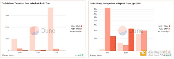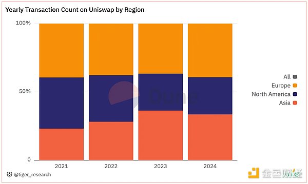 這一變化突顯了兩個(gè)趨勢。首先,亞洲開發(fā)者正在推動(dòng)Blockchain創(chuàng)新。其次,Blockchain開發(fā)正從西方起源擴(kuò)展到全球。高活躍度的測試網(wǎng)活動(dòng)反映了積極的實(shí)驗(yàn),也表明亞洲開發(fā)者是Web3未來的關(guān)鍵貢獻(xiàn)者。4.3.亞洲零售投資者在去中心化交易平臺(tái)(DEX)交易中的參與