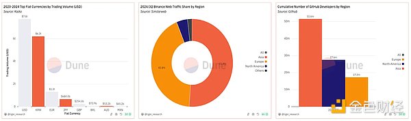 其次,亞洲在交易活動(dòng)方面表現(xiàn)出色:2024年初,韓國基于韓元的交易量超過了美元交易量,最近一半以上的BN網(wǎng)站流量也來自亞洲。