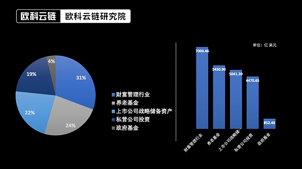 c.私營公司按照現(xiàn)在已披露的對公開上市公司的比重90%進行同步計算。d.財富管理行業(yè)根據摩根斯坦利、Capgemini、埃森哲等調查報告,高凈值人群中已有71%進行了對Bitcoin的投資,選取剩余待投資的高凈值人群財富規(guī)模乘以成長系數4.5%再乘以投資比例5%進行測算。