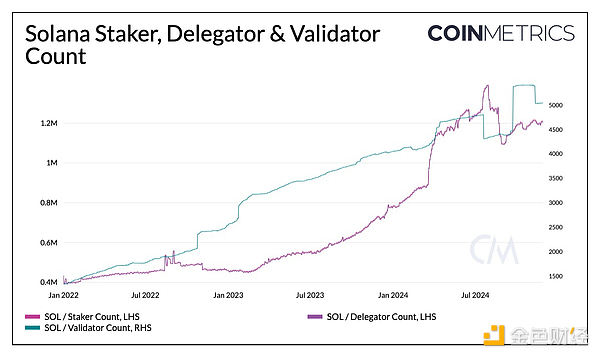 Ethereum擁有更大的驗證者集,有107萬個驗證者,而對硬件要求更高的Solana擁有5,048個驗證者,但委托人超過121萬個。