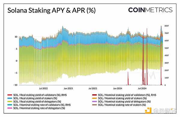 Ethereum的名義質(zhì)押收益率為3.08%(經(jīng)通脹調(diào)整后為2.73%),是鏈上經(jīng)濟的基準。Solana提供更高的收益率,為11.5%(實際收益率為12.5%),但由于獎勵結(jié)構(gòu)不同,委托人的收益低于驗證者。