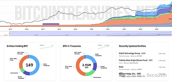 這些持有Bitcoin的主體中,73家是上市公司,18家私企,11個國家,42個ETFs或Funds,5個DeFi協(xié)議。