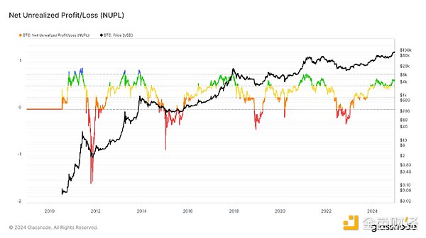 圖4: BTC未實現(xiàn)凈利潤/虧損圖,目前處于0.62水平,處于信心-否認(rèn)階段