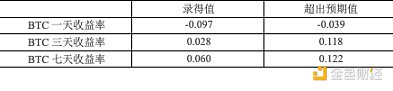 除了美聯(lián)儲每年8次的利率調(diào)整外,美國定期發(fā)布的宏觀數(shù)據(jù)也能反映當(dāng)前貨幣政策下的經(jīng)濟狀況,市場通常根據(jù)這些數(shù)據(jù)預(yù)測貨幣政策改革或經(jīng)濟周期變化,從而影響幣價。重要的宏觀數(shù)據(jù)包括美國季調(diào)后非農(nóng)就業(yè)人口變動、初請失業(yè)金人數(shù)、實際國內(nèi)生產(chǎn)總值(GDP)年化季率以及核心居民消費價格指數(shù)(CPI)月率。下表列出了2024年Bitcoin幣價在這些指標(biāo)發(fā)布當(dāng)天、三天內(nèi)和七天內(nèi)的短期收益率與各宏觀指標(biāo)的錄得值和超出預(yù)期值之間的相關(guān)性。