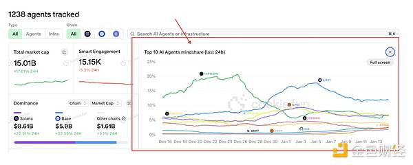 實(shí)時(shí)鏈上分析工具,利用其泡泡掃描儀可以快速識(shí)別哪些項(xiàng)目正在吸引注意力或正在失去關(guān)注,目前能夠跨多個(gè)鏈跟蹤50多個(gè)AIAgentTokens。