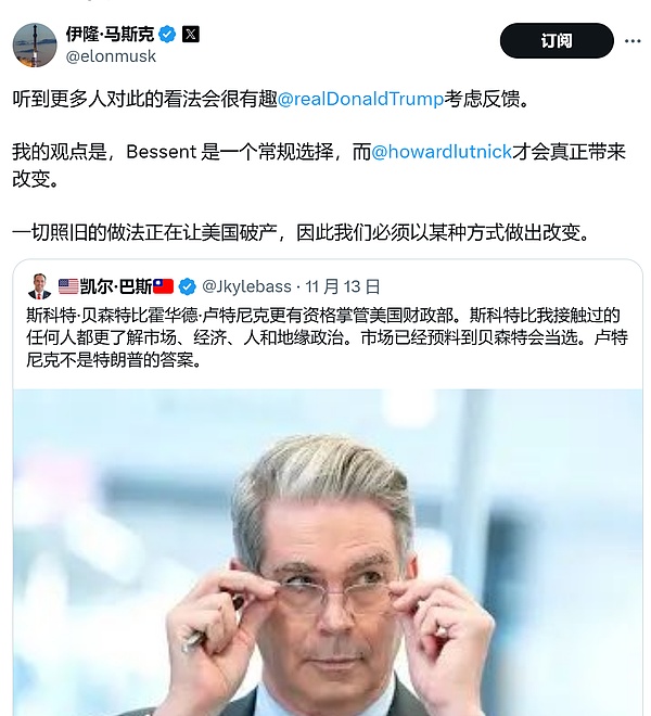 盧特尼克的提名得到了多方支持。衛生部長被提名者小羅伯特·肯尼迪(RobertF.KennedyJr.)在社交媒體上稱贊他是“Bitcoin最強有力的倡導者”,而馬斯克也公開支持盧特尼克出任財政部長。