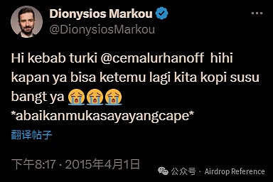 頭像正規,藍勾認證,ID是:DionysiosMarkou,自稱CoinDesk的副主編。