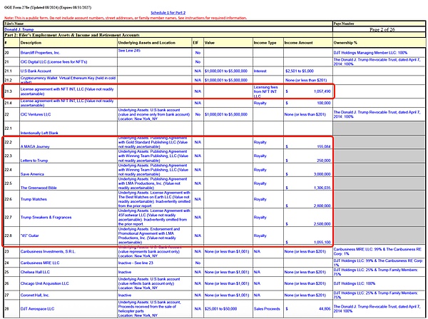 需要重點(diǎn)說明,這份財(cái)務(wù)狀況披露文件的截止日期為2025年1月。因此,發(fā)行于今年1月18日的“特朗普Meme幣”TRUMP的相關(guān)收入以及隨后包括MELANIATokens、WLFI發(fā)行的USD1等相關(guān)收入均未收錄在內(nèi)。饒是如此,特朗普的個(gè)人資產(chǎn)也已稱得上“家資頗豐”。特朗普的名利場(chǎng):文娛、政治兩手抓,Title不止美國(guó)總統(tǒng)
