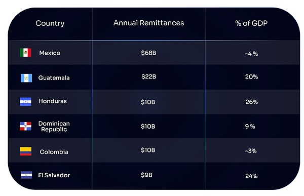拉美已是加密原生。萬億級加密交易量,穩(wěn)定幣占鏈上結(jié)算50–90%;1.22億無銀行賬戶卻手握智能手機(jī);1630億美元僑匯仍被6–8%手續(xù)費(fèi)盤剝;178%的通脹讓“拿到美元”成為剛需。