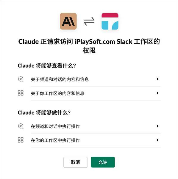 Slack 賬號(hào)和工作區(qū)都準(zhǔn)備好了就可以“一鍵安裝 Claude”了。但現(xiàn)在你需要先準(zhǔn)備一個(gè)美國(guó) IP 的網(wǎng)絡(luò)環(huán)境,然后「點(diǎn)擊 Add to Slack 這個(gè)鏈接」即可在 Slack 里添加 Claude 機(jī)器人應(yīng)用?吹綄(duì)話框,點(diǎn)擊“允許”給予權(quán)限即可,至此我們就已經(jīng)全部搞定了,非常的簡(jiǎn)單!