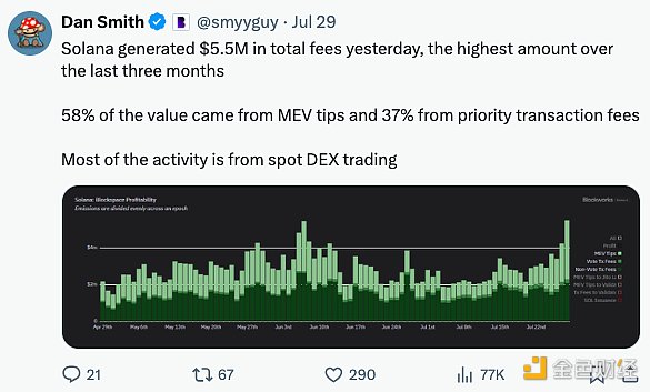 例如,7 月 26 日星期五,ETH 的交易筆數為 110 萬,而 DAU 為 376.3 萬,平均每位用戶每天的交易量約為 2.92 筆。然而,SOL 的交易筆數為 2.822 億,而 DAU 為 130 萬,平均每位用戶每天的交易量高達 217 筆。