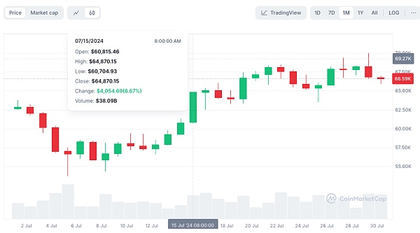 1.7月15日-7月28日,BTC強勢反彈,最高上漲至6.9萬美元(7月27日),收漲12.56%。ETH最高上漲至3543美元(7月22日),7月23日Ethereum現(xiàn)貨ETF正式獲批上市交易后,ETH經(jīng)歷短暫上漲,然后開始下跌,收于3269美元,收漲2.44%。預(yù)期灰度EthereumETF流出壓力相比當(dāng)時BitcoinETF要小,而整體EthereumETF的規(guī)模和增長速度將不及Bitcoin現(xiàn)貨ETF,以至于Ethereum漲幅也會小于當(dāng)時BTC的表現(xiàn)。BTC現(xiàn)貨ETF上市后,BTC價格2個月后突破歷史新高,漲幅達到62%。